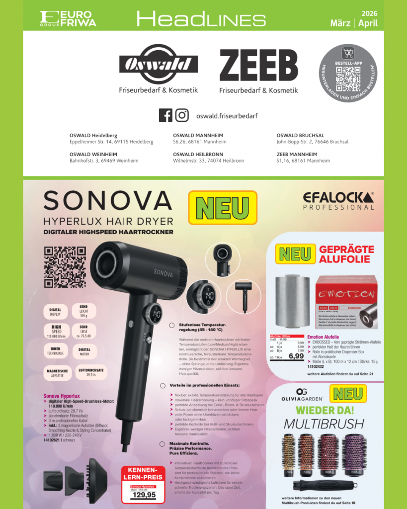 Als digitale Übersicht bietet er alle aktuellen Angebote und Aktionen speziell für den professionellen Salonbedarf. In dieser Ausgabe finden unsere gewerblichen Kunden: Frühlingsdeals: sichere Dir tolle Prämien beim Kauf von Wella Produkten im Wert von ab 150 € Die Multibrush ist wieder da: Olivia Garden Multibrush ist Rundbürste und